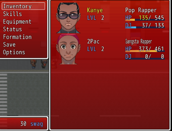 ファイナルファンタジーのようなビジュアルの基本操作画面では十字キーでキャラクターを「移動」、Enterキーで「しらべる・話しかける」ことができます。Shiftキーを押しながら歩くと素早く動けるのでドンドン活用しましょう。歩き回っていると遭遇する敵には有名ラッパーやプロデューサーが起用され、本人のヒット曲戦闘シーンで流れるので雰囲気も十分です。ボスキャラは倒した後仲間になる場合もあるので、2Pacなど有名ラッパーをパーティーに加え操作できる楽しさもあります。低スペックでかわいらしい絵なわりに敵のレベルが初めからやたらと高く、気を抜いているとすぐにゲームオーバーとなってしまうので小まめにEscキーでメニュー画面を開き、セーブしましょう。